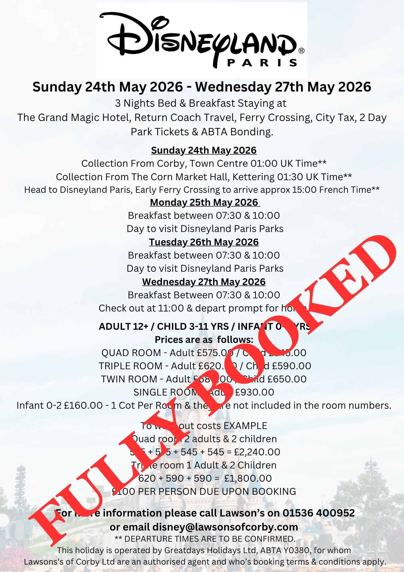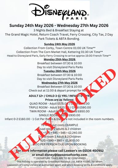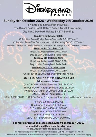 For a price tailored to your group please email us disney@lawsonsofcorby.com